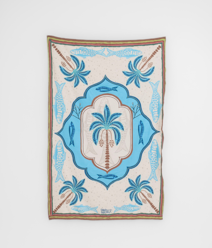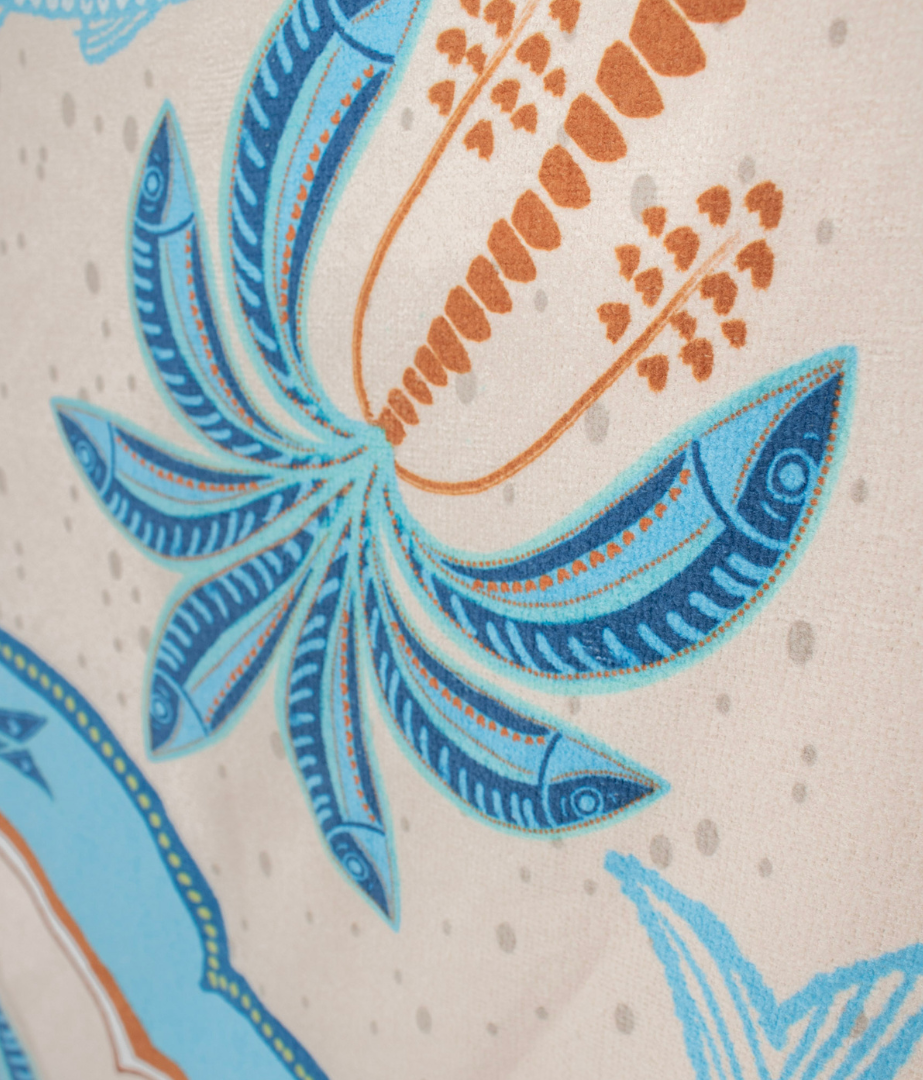 Leve mais conforto, praticidade e arte para os seus momentos de lazer com a Canga Atoalhada Coqueiro Sardinhas do Estúdio Ira.